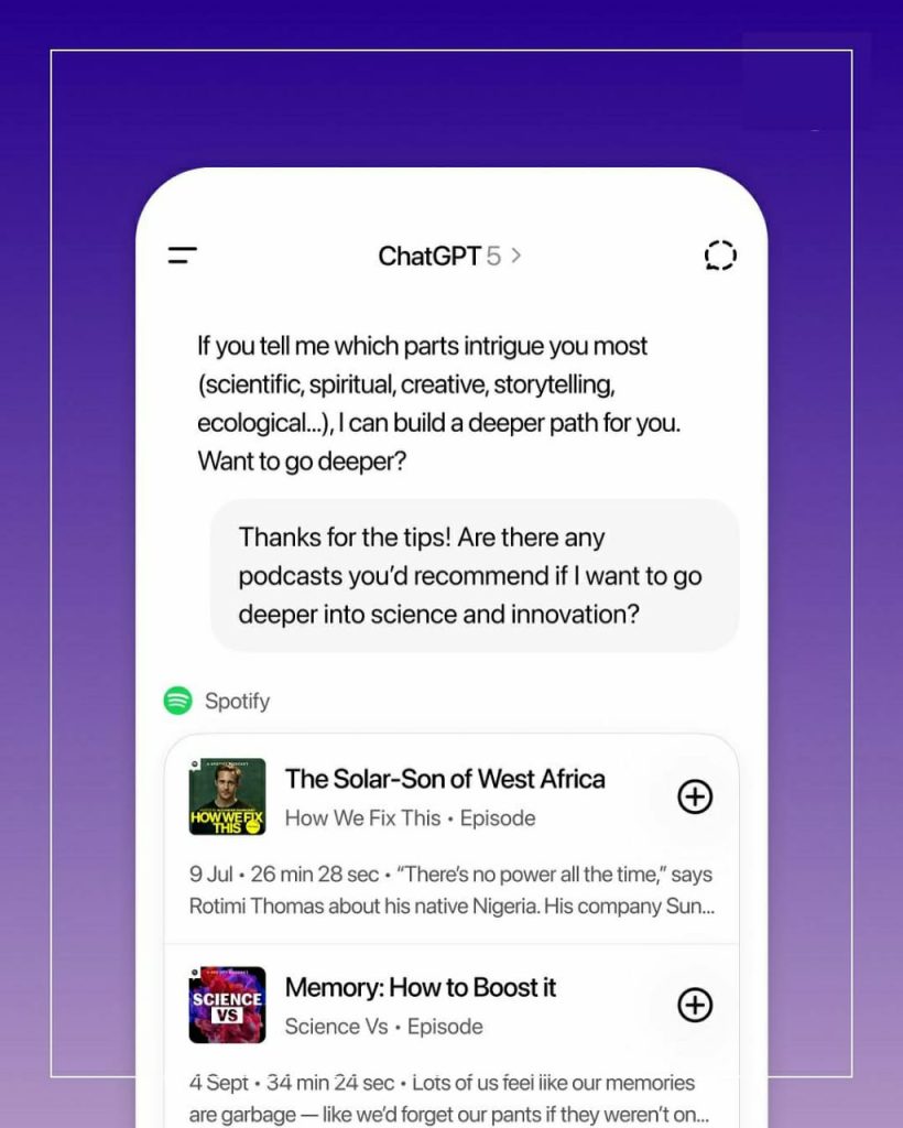 Spotify is extending its reach once again, this time, into ChatGPT. From cars to TVs and even gaming consoles, Spotify has long been everywhere listeners are. Now, with its integration into ChatGPT, discovering your next favorite song or podcast has become even more intuitive and conversational.